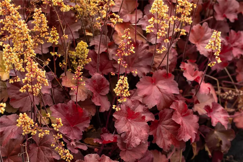 Heuchera x heucherella 'Tapestry' Mit einem Purpurglöckchen im Garten wird es definitiv nie langweilig! Aber wie wäre es mit gleich mehreren Exemplaren? Denn die Staude gibt es nicht nur in einer Form und Farbe. Mit unzähligen Sorten bleiben bei diesen Stauden keine Wünsche offen. Bekannt sind sie vor allem für ihr Laub, das in den schönsten Farben daherkommt. Einfarbig, mehrfarbig oder gemustert, Grün, Orange, Dunkelrot, Silber oder Bronze – wer die Wahl hat, hat die Qual. Aber eine Qual ist das Aussuchen der perfekten Purpurglöckchen auf keinen Fall, denn egal für welche Sorte man sich entscheidet, einen Fehler macht man damit nie. Denn nicht nur die Farbe der Blätter ist ein Hingucker, auch die Form kann von Pflanze zu Pflanze variieren. So gibt es die Blätter gewellt, gezack, gekräuselt oder glatt und jede dieser Formen ist etwas ganz Besonderes. Neben den besonderen Blättern sind es auch die kleinen filigranen Blüten, die die Staude so beliebt machen. Die schweben von Mai bis Juli auf dem bunten Laub und zeigen sich in Weiß, Rot oder Rosa.