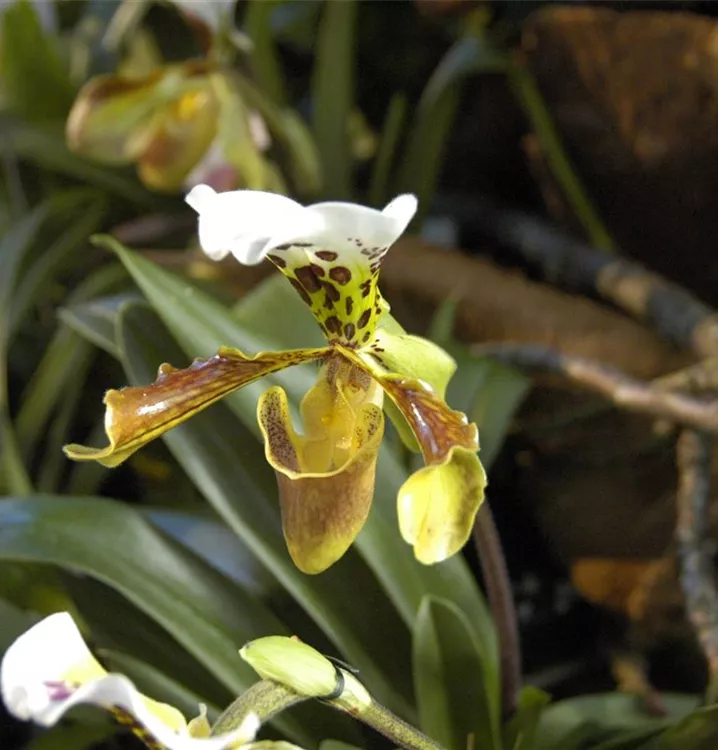 Paphiopedilum bringt von Oktober bis März dekorative mehrfarbige Blüten hervor.